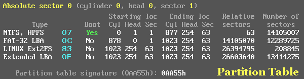The following discussion shows views of various Partition Tables as interpreted by a disk editor. To see how they actually look (as Hexadecimal bytes) on the drive, open this page: Introduction to Partition Tables.