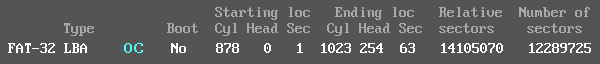 Our FAT32 partition has a Partition Type of 0Ch (FAT32 LBA) which means that at least part of it extends past the 8.4 GB mark. It begins at CHS 878,0,1 (which corresponds to Absolute Sector 14,105,070), but the ending CHS values only mean that its last sector is somewhere beyond the 1024th cylinder! In this case, we must work out its actual location using both the "Relative" and "Total Number" of Sectors; which is still rather easy to compute for Primary Partitions: 14,105,070 + 12,289,725 - 1 = Absolute Sector 26,394,794.