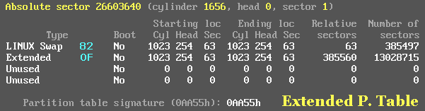The much more interesting (and difficult for some to understand) Extended Partition begins at pseudo-CHS 1656,0,1 (1643 + 13 = 1656). As we pointed out in our Introduction to Partition Tables page, this entry only tells you the total size of the Extended Partition (and where it begins) but you know nothing about what's inside of it until you examine the Extended Partition Table that this entry points to; which could lead you to many other EBRs inside this partition!!!