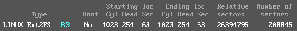 The /boot partition for our Linux (the Partition Type for a Linux Ext2/Ext3 File System is: 83h) installation begins at Absolute Sector 26,394,795 (or a pseudo-CHS of 1643,0,1). This partition is rather small (only 208,845 sectors; or 106,928,640 bytes; about 102 MiB); ending at Absolute Sector 26,603,639.