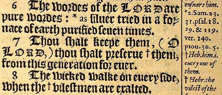 The following image was made from a digital photograph of an original "Great He" edition of the Holy Bible printed in 1611 by Robert Barker (London, England). The image contains the words of Psalm 12 verses 6-8 and their marginal notes. (We believe the King's Translators would be appalled if they knew copies of their Bible version were being printed without any of its translation notes! They also wrote a very long preface about their translation which never appears in Authorized Versions printed in the USA; except for facsimile reprints of early British editions.) Observe the