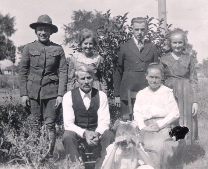 From Left to Right: Emma (9), Anna (17), Margaret (3), Susanna (42), Mary (12), Sue (6).![]() (Picture provided by Matthew Schademann, 2016.) George's family; about 1917. Back row: Emma and Mary; Middle: George, Margaret, Susanna; Front row: Sue (standing), Anna (sitting with her daughters, Viola and Evelyn--rubbing her eye), and John. ![]() This photo had only "Around 1917 or 1918" on back. Standing (Left to Right): George ("Uncle Bill") in uniform. Assuming a date of April 30, 1918 would make him 27-1/2, then Emma (16), John (21-1/2) and Sue (13-1/3). Seated: George (49-2/12) and Susanna (49-2/12), and Margaret (9-10/12) kneeling in front. ![]() Neither Anna (24-1/12) nor Mary (18-11/12) are shown in this picture. | |||||||||
