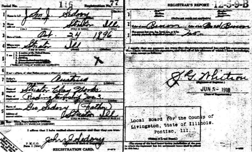 Grandma fell victim to a stove explosion, as I've heard the story told. Whether it was a coal, wood or oil fire, I don't know. She was supposed to have had her clothing and hair ignited from the blast, and I think the reason I don't know more about it is because I wanted to spare myself the agony of it all. So Grandpa Sedory was alone, though other of his children lived close by, especially the Novotney family (Aunt Anna), who I think may have lived next door to him. Another thing about Grandpa Sedory is the fact (hope I'm not wrong about this) he spoke very little English, making it difficult for us kids who spoke only English to communicate with him. In case this is incorrect data, it somehow just wasn't appropriate for us to spend vacations with him, while it was perfectly ideal for us to stay at the Vagasky's (Mom's folks). ChicagoSomewhere in the year after Marie's birth, the family moved to Chicago. The only reason I can think of for such a move was to provide better work opportunities for Dad. This was the beginning of changes that would follow [our move] to that city. It had to be 1925, because the fourth sibling joined us there in Chicago on September 8th of that year. It was another boy, Edward Thomas. So now there were two younger and one older than I among us kids. What had already been a "job" in handling three kids now grew. Mom's time surely was well occupied, and Dad's responsibilities in providing for us also broadened. The house in Chicago couldn't have been very large, and the living conditions evidently nothing to brag about, either; so we were off for another move! I doubt we lived there for more than a year or so. It also could have been that Dad located work at the [Editor's Note: Some time in the summer of 1918, John "Jack" Sedory, who had turned 21 on October, 24th, 1917, had to fill out a 'draft card' for the second registration of WWI. We see he used a middle initial "J" for his name, and that he was employed at the "Streator Clay Works". This was, or at least started as (back in the 1890s or earlier), a mining company; with underground shafts. For the 1920 US Census, on January 28th, 1920, both John 'Jack' Sedory and his father George are listed as working at a "Brick Yard"; so our author's father already had brick yard experience before moving to Chicago.] | |||||||||