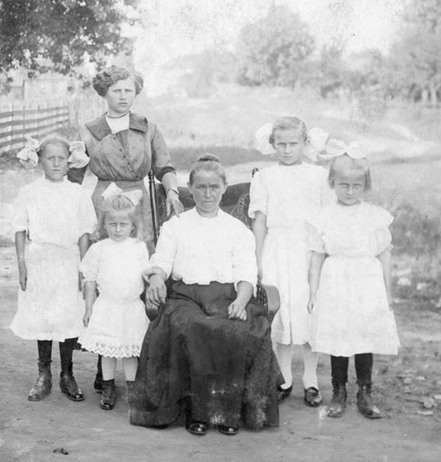 That marriage brought six children: Anna [3-27-1894], John ("Jack" - my Dad [October 24, 1896]), Mary [5-17-1899], Emma [4-30-1902], Susanna (Sue [1-7-1905]) and Margareta (Margaret [6-29-1908]). Uncle George [or "Bill"] carried the Novotny name. [Editor's Note: Both the date and location of the following photo of George's girls is unknown. However, Margaret appears (to this editor) to be no older than 3. If we assume it was taken the end of June, 1911, Margaret would have just turned 3, and Anna would be 17 and single (she was married on September 9, 1912).] | |||||||||
