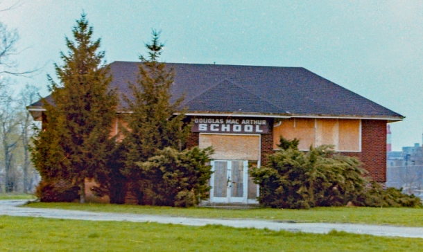 However, the 1969 booklet titled, Pioneers of Progress, . . . the history of STICKNEY TOWNSHIP, contains the statement: "By 1918, however, the facility was outgrown and the three room bungalow-type school which we now know as the Douglas MacArthur School - named for the famous general - began its operation at 41st and Cuyler avenue with fifty pupils." (Page Thirty). This fits nicely with someone who wrote on the back of a photo: "Opened 1919 school-year". When was the sign placed on it? In May, 1967, a pamphlet commemorating a reunion of early students of the school used "Little Red School House" as the name of the school. Yet a number of old pictures from the 1950's and later, have a large sign on it, declaring it to be the "DOUGLAS MAC ARTHUR SCHOOL" as shown here, in one of the last photos ever taken of it in 1979; shortly before it was burnt down by the Stickney Fire Department:
